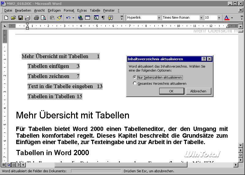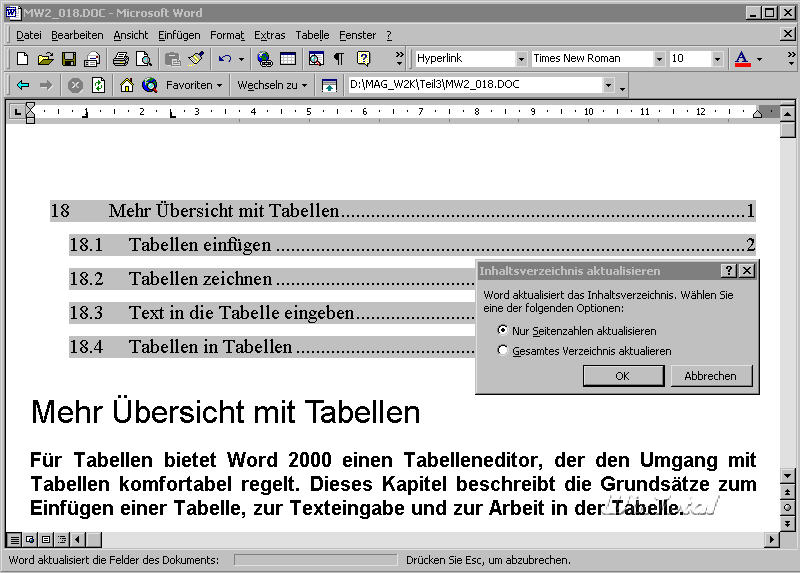 Sie aktualisieren ein Inhaltsverzeichnis, wenn Sie das Verzeichnis markieren und die [F9]-Taste betätigen. Dabei haben Sie die Wahl, ob das Verzeichnis neu erzeugt wird oder nur die Seitenzahlen eine Aktualisierung erfahren (s. Abb. 18).