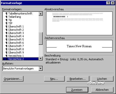 Der Befehl Format -> Formatvorlage liefert weitere Informationen über die Formatvorlagen (s. Abb. 3). Wenn in der Dialogbox das Listenfeld Anzeigen aufgeklappt wird, erscheinen alle Formatvorlagen. Nach Auswahl einer Vorlage stehen über die Schaltflächen alle Werkzeuge zur Veränderung bereit.