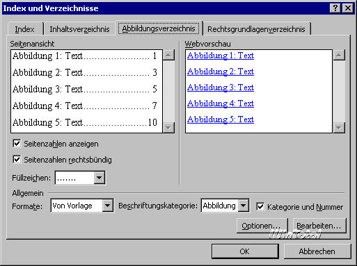 Nach diesen vorbereitenden Arbeiten erledigt Word dann bei der Endfassung des Dokuments den Rest: Sie platzieren noch die Schreibmarke an die gewünschte Stelle im Dokument, wählen in der Dialogbox Index und Verzeichnisse die Registerkarte Abbildungsverzeichnisse und dort die gewünschte Kategorie. Die Bestätigung der Dialogbox löst die Erstellung des Verzeichnisses aus.