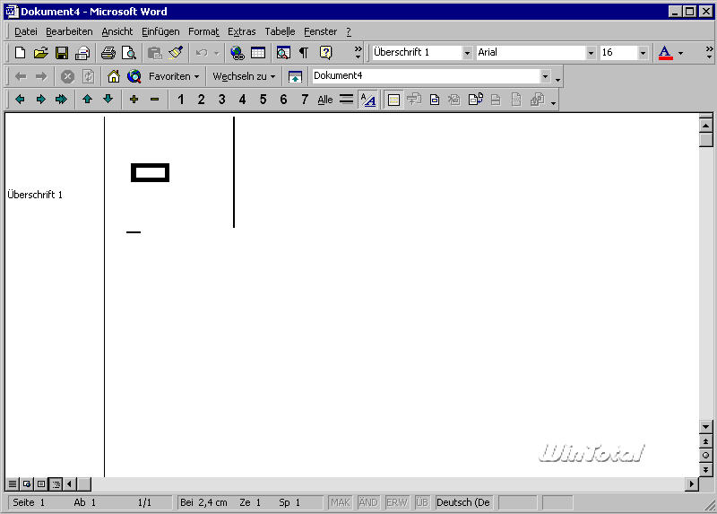Abb. 6: Ungewohnt, aber zweckmäßig – die Gliederungsansicht von Word mit Symbolleiste, Formatvorlagenanzeige und der Einfügemarke hinter dem „Minusbalken“. |