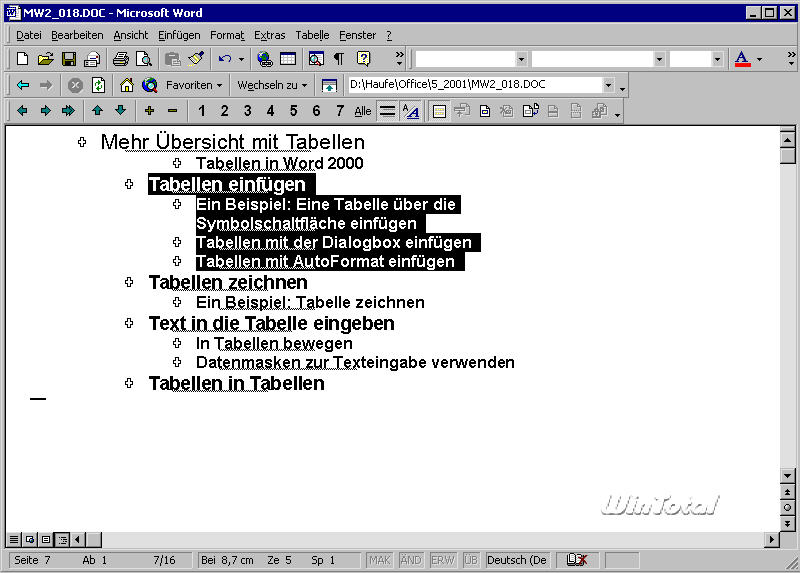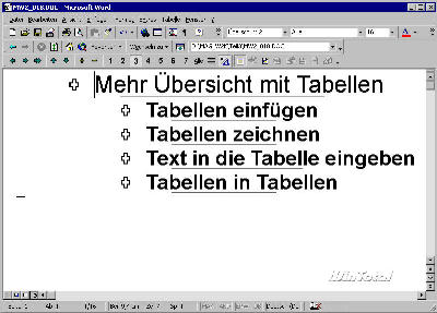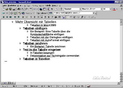 Anschließend setzen Sie also mit der nächsten Überschrift der gleichen Ebene fort oder Sie stufen die Überschriftebene für die Eingabe einer nachgeordneten Überschrift herab. Dazu nutzen Sie die Tab-Taste, die in der Gliederungsansicht eine ungewöhnliche Funktion hat. Statt wie üblich ein Tabulatorzeichen zu erzeugen, stuft diese Taste einen Absatz in der Hierarchie um eine Ebene herab.