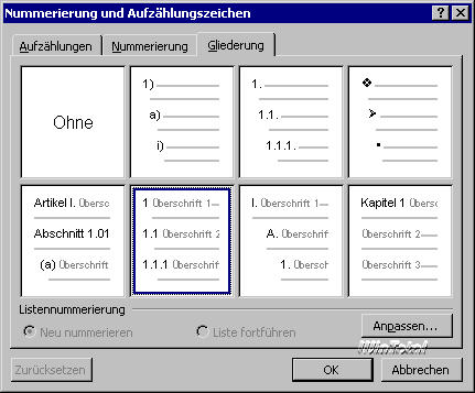 Abb. 9: In der Dialogbox Nummerierung und Aufzählungszeichen haben Sie die Wahl zwischen verschiedenen Nummerierungsformaten. |