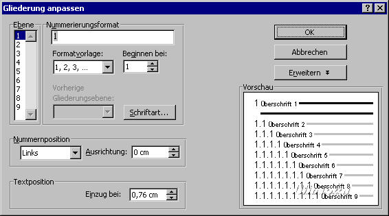 Abb. 10: Die Dialogbox Gliederung anpassen in der erweiterten Darstellung: Veränderbar ist von der Schriftart über das Zahlenformat bis hin zur Position der Nummerierungselemente alles – wenn der Aufwand wirklich nötig ist. |