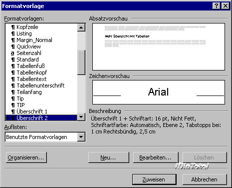 Abb. 3: Die Dialogbox Formatvorlage regelt den Zugriff auf die Formatvorlagen – sie ist die Zentrale zum Erstellen, Bearbeiten und Zuweisen. |