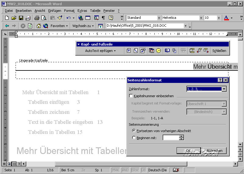 Viele Dokumente erfordern wiederkehrende Inhalte auf folgenden Seiten. Besonders bei langen Texten ist es oft nötig, die Seitenzahlen oder andere Textelemente auf allen Seiten anzugeben. Dafür stellt Word die Kopf- und Fußzeilen zur Verfügung – eine etwas verwirrende Bezeichnung für besondere Textelemente, die längst nicht nur auf eine Zeile beschränkt sind.