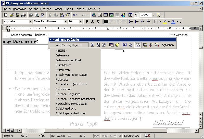 Ohne weitere Einstellungen besteht jedes Dokument zunächst aus nur einem einzigen Abschnitt. Für die Arbeit mit Kopf- und Fußzeilen teilen Sie das Dokument in mehrere Abschnitte ein. Um ein Dokument in Abschnitte aufzuteilen, fügen Sie an den gewünschten Stellen über Einfügen -> Manueller Wechsel (oder Umbruch) einen Abschnittswechsel ein. Arbeiten Sie mit Filialdokumenten innerhalb eines Zentraldokumentes, erzeugt Word die Abschnittswechsel beim Erstellen der Filialdokumente selbst.