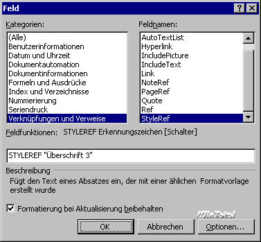 Abb. 14: Die Feldfunktion StyleRef aus der Kategorie Verknüpfungen und Verweise holt den Text eines Absatzes an die gewünschte Stelle. |