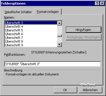 Aktivieren Sie den Eintrag Verknüpfungen und Verweise im Bereich Kategorien. Nach Auswahl der Feldfunktion StyleRef (Word 97: FVRef) klicken Sie auf „Optionen“ (s. Abb. 14). In der Dialogbox Felderoptionen finden Sie die Registerkarte Formatvorlagen. Im Bereich Namen klicken Sie erst auf die gewünschte Formatvorlage, dann auf Hinzufügen (s. Abb. 15). Dabei kommt dem Klick auf Hinzufügen besondere Bedeutung zu: Wenn Sie die Dialogbox lediglich mit OK bestätigen, dann wird die Formatvorlage nicht an die Feldfunktion gehängt.