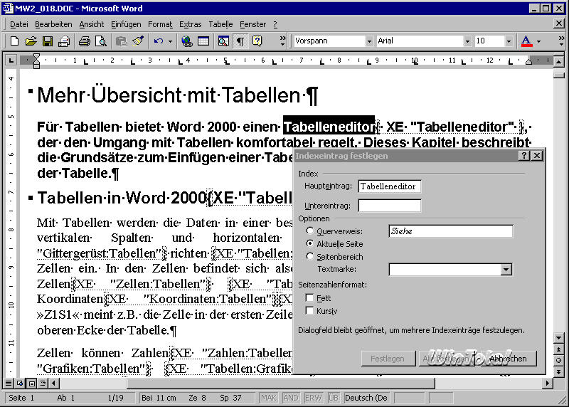 Die Dialogbox zum Festlegen der Indexeinträge bleibt geöffnet, so dass Sie weitere Einträge in einem Arbeitsgang festlegen können. Sie klicken dazu neben der Dialogbox in das Dokument, suchen den nächsten gewünschten Eintrag, markieren diesen und klicken wieder in die Dialogbox. Word übernimmt die Markierung automatisch in das Eingabefeld Haupteintrag.