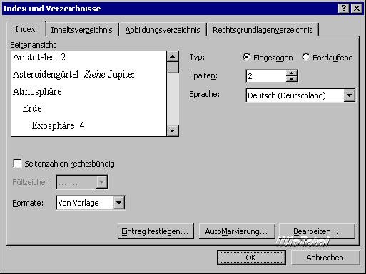 - Im Register Index regeln Sie den Typ, die Spaltenanzahl, die Sprache und die Gestaltung des einzufügenden Indexes. Außerdem führen Schaltflächen zur Festlegung von Einträgen und zum Bearbeiten der für den Index verwendeten Formatvorlagen.