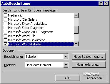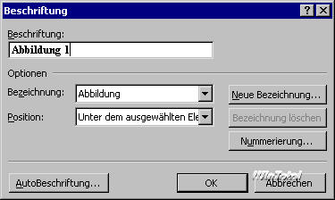 Danach erstellt Word sofort in dem Augenblick, in dem Sie ein Objekt der gewählten Art in Ihr Dokument einfügen, die zugehörige Beschriftung. Lassen Sie sich von Word verwöhnen: Legen Sie für jeden Objekttyp, den Sie verwenden wollen, eine automatische Beschriftungsart fest. Bei jedem Einfügen eines solchen Objektes wird dieses sofort mit der richtigen Kategorie beschriftet. Sie brauchen sich also keinerlei Gedanken mehr um dieses Problem zu machen – lediglich den konkreten Text müssen Sie natürlich manuell ergänzen. Aber die formalen Dinge erledigt Word zuverlässig: Selbst wenn Sie zwischendurch Objekte anderer Art einfügen, merkt sich Word die aktuelle Nummer des entsprechenden Objekttyps.