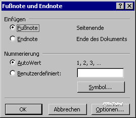 Abb. 22: Nach einem Klick auf die Schaltfläche Optionen erhalten Sie weitere Einstellungsmöglichkeiten für Fuß- und Endnoten. |