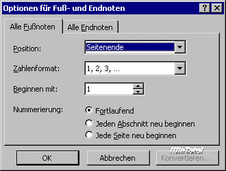 Endnoten können Sie, anders als Fußnoten, am Dokumentende oder am Abschnittsende sammeln. Sollten Sie mit einem Zentraldokument arbeiten, dann stellen die Filialdokumente automatisch separate Abschnitte dar, an deren Ende die Endnoten gesammelt auftauchen können. Die Unterschiede bei der Behandlung von Endnoten sind geringfügig. Das Einfügen über die Tastatur erfolgt durch [Strg]+[Alt]+[D] (Word 2000/XP/2003), ansonsten verwenden Sie den gleichen Menübefehl wie bei den Fußnoten. Die restlichen Einstellungsmöglichkeiten entsprechen weitestgehend denen für Fußnoten. Es ist zwar sinnvoll, aber Sie müssen sich beim Umgang mit Fuß- und Endnoten nicht sofort entscheiden, nach welchem Verfahren Sie arbeiten. Mit der Schaltfläche Konvertieren der Dialogbox Optionen für Fuß- und Endnoten haben Sie nachträglich die Entscheidung in der Hand, ob Sie die Noten konvertieren oder vertauschen.