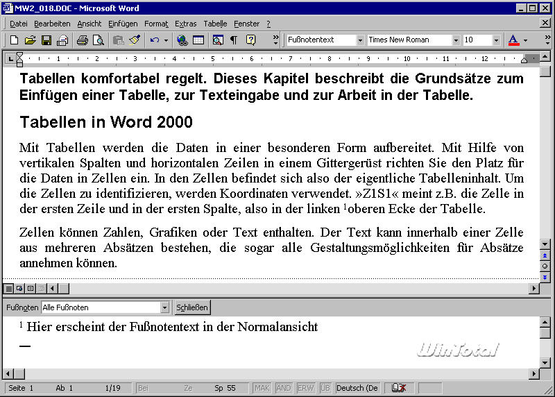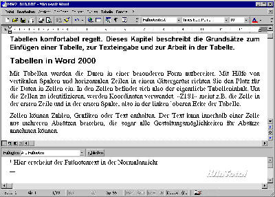 Interessant ist nach dem Erstellen der Fußnote die Normalansicht. Im unteren Bereich des Bildschirms erscheint der Bereich für den Fußnotentext, während im oberen wie zuvor der „normale“ zu sehen ist (s. Abb. 23). Im Text sehen Sie das Fußnotenzeichen hinter dem zugehörigen Textteil. Ist die Anzeige der nicht druckbaren Zeichen aktiviert, ist die Ziffer durch ein kleines, gestricheltes Kästchen umrahmt. Im Fußnotenbereich sehen Sie die gleiche Ziffer, hinter der die Schreibmarke auf den Fußnotentext wartet. Dazwischen, gleichsam als Trennobjekt zwischen beiden Bereichen, befinden sich in der Normalansicht eine Schaltfläche zum Schließen dieser Ansicht sowie ein Listenfeld, mit dem Sie z.B. die Fußnotentrennlinie einfügen und anschließend anpassen.