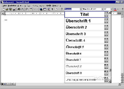 Die Liste der Formatvorlagen klappt durch Klick auf den Listenpfeil am Listenfeld Formatvorlage auf der Symbolleiste Format auf (s. Abb. 2). Die im Lieferumfang von Word enthaltenen etwa 90 Formatvorlagen bieten selbst ohne weitere Bearbeitung einen stattlichen Fundus. Ein Klick auf eine der angezeigten Formatvorlagen weist diese – je nach Markierung – einem oder mehreren Absätzen zu. Um einem einzelnen Absatz eine Formatvorlage zuzuweisen, muss sich die Schreibmarke lediglich innerhalb des Absatzes befinden. Eine weitere Markierung ist nicht nötig.