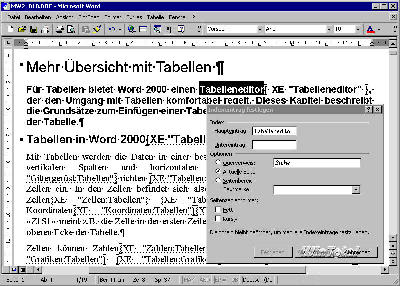 Die Dialogbox Index und Verzeichnisse, die Sie mit dem Menübefehl Einfügen -> Index und Verzeichnisse aktivieren, macht die Indexerstellung und das Generieren eines Inhaltsverzeichnisses leicht. Die Dialogbox besteht aus vier (Word 97: drei) Registern – mit einem Klick auf OK erzeugen Sie das mit dem angezeigten Register aktivierte Verzeichnis an der Schreibmarke.