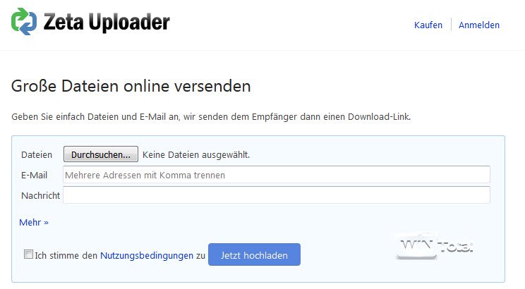 Für einen Datentransfer mittels Cloud-Diensten wie Dropbox muss sich sowohl der Sender als auch Empfänger bei dem jeweiligen Dienst registrieren. Beim Onlinedienst Zeta Uploader lassen sich Dateien bis zu 500 Mbyte Größe ganz ohne Anmeldung versenden und nach Wunsch zusätzlich mit einem Passwort schützen.