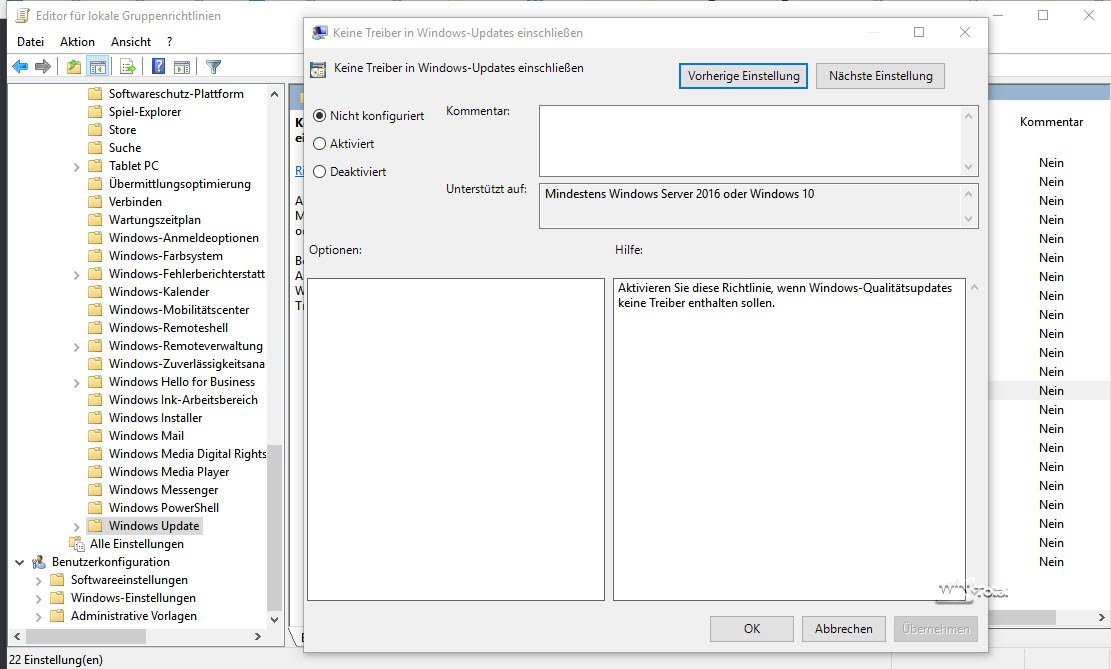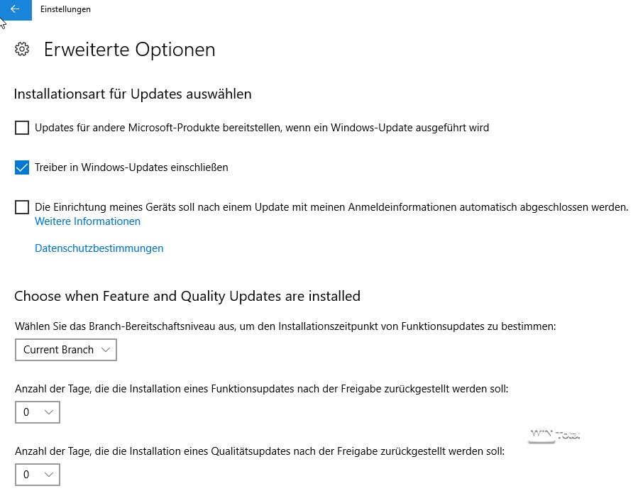 Erst das Creators Update (1703) bietet eine Option, Treiber vom Windows Update auszuschließen, welche sich in den Windows-Update-Einstellungen hinter den erweiterten Optionen versteckt.