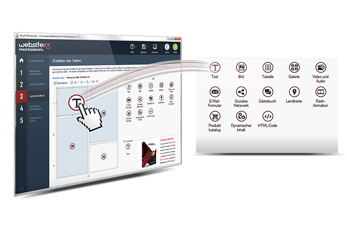 Sie arbeiten immer in einem visuellen Modus, auch bei den erweiterten Einstellungen, und können auf eine leicht verständliche Arbeitsumgebung mit Echtzeit-Vorschau zählen. Außerdem bietet WebSite X5 alle Instrumente, die Sie benötigen, um ansprechende, interessante und professionelle Websites zu erstellen. Mit WebSite X5 sind Ihre nächsten Websites immer nur einen Klick entfernt.