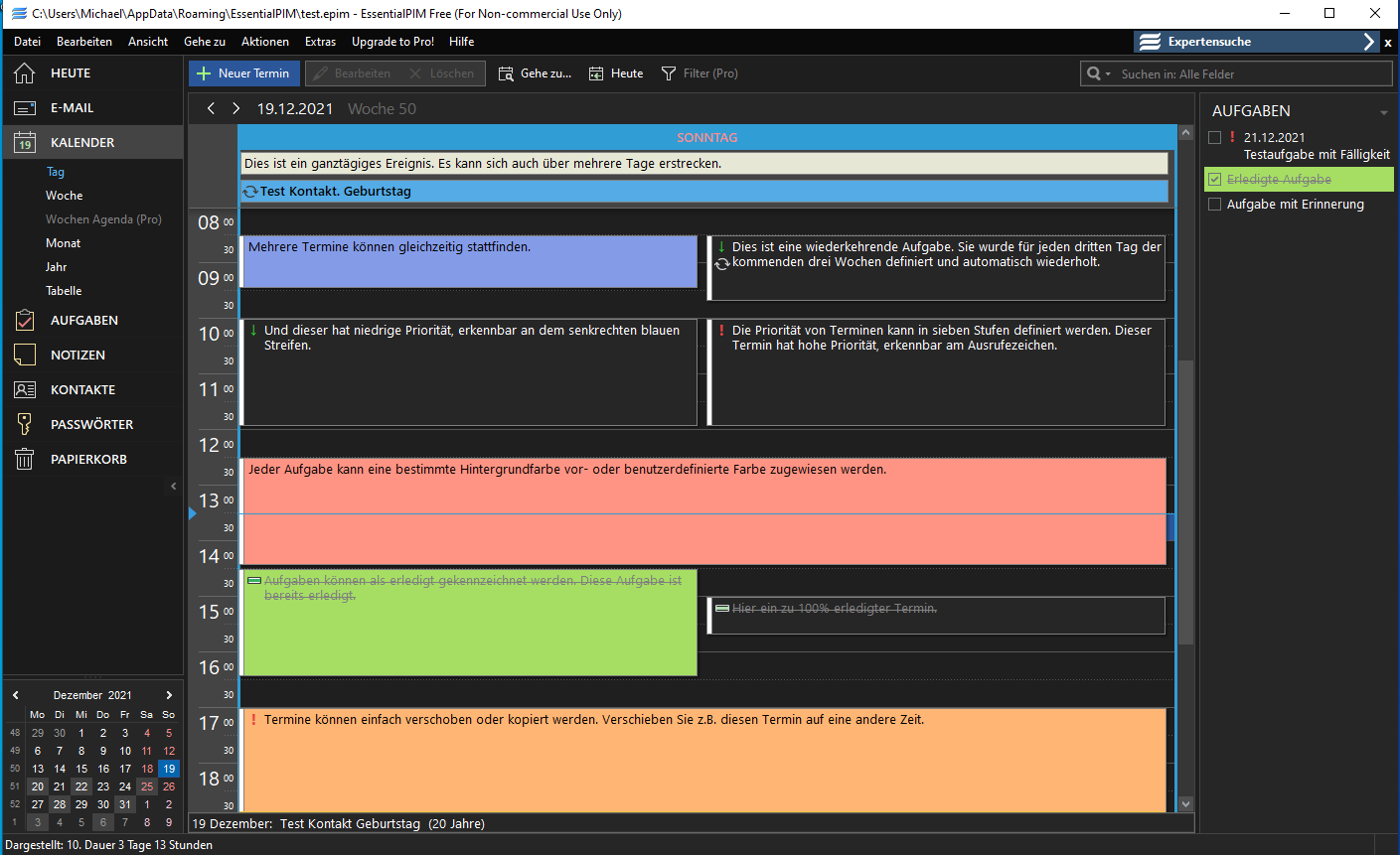 Die für den Artikel relevanten Kalenderfunktionen sind in der Freeware auch eingeschränkt und lassen beispielsweise editierbare Kategorien oder anpassbare Ansichten sowie erweiterte Druckfunktionen vermissen. Da auch die Aufgaben im Kalender nur in der Pro-Fassung angezeigt werden, ist die kostenlose Variante unnötig eingeschränkt. Im Gegenzug gibt es aber auch für freie Kalender Software mobile Apps, welche zwischen dem Desktop-Client und den Apps synchronisieren.