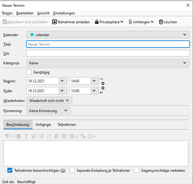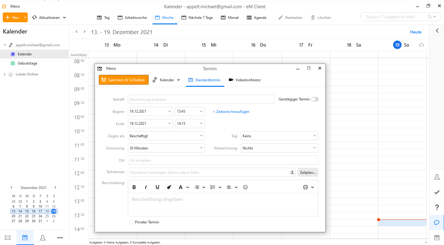 Sie können mehrere Kalender einblenden und mit einem Doppelklick neue Termine anlegen. Die Eingabemaske bietet dabei auch die Möglichkeit, weitere Teilnehmer über deren Mailkonto einzuladen oder eine umfangreiche Beschreibung nebst Anhängen und Bildern anzulegen. Frei definierbare Kategorien erleichtern die Übersicht im Kalender.
