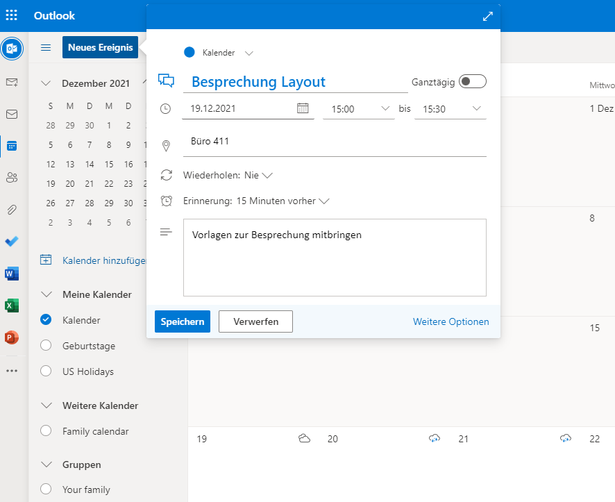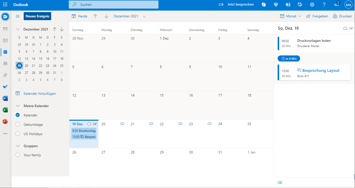 Bereits in Windows 10 und dem neuen Windows 11 hat Microsoft mit der Kalender-App eine sehr einfache Terminverwaltung in Windows integriert. Diese kann aber weder die Termine in brauchbarer Form ausdrucken, noch mit anderen Nutzern teilen oder exportieren und lässt auch sonst viele Funktionen vermissen, um gegenüber unseren übrigen Kandidaten bestehen zu können. Damit bietet sich die Kalender-Software in Windows nur für geringste Ansprüche von Heimanwendern an.