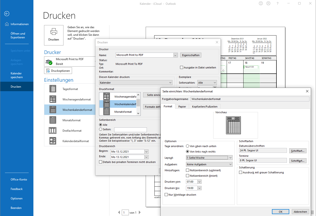 Fremde Kalender können im ICS oder VCS-Format importiert als Webkalender eingebunden werden. Für iCloud-Inhalte aus der Apple-Welt bietet Apple selbst mit iCloud für Windows eine Brücke nach Outlook, um Kontakte, Aufgaben und Kalender auch in Outlook zu nutzen. Wer noch ergänzend einen Terminplaner aus echtem Papier nutzt, wird sich über die vielen Druckformate für Filofax, Chronoplan und Co. freuen, welche noch individuell angepasst werden können. Die Ausgabe als PDF über den Print to PDF-Drucker von Windows können im übrigen alle hier vorgestellten Dienste und Programme.