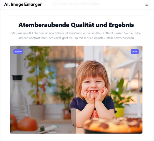 AI.Image.Enlager ist ein weiteres Tool, auf mit KI Bilder zu vergrößern. Der Hersteller bietet mit dem Online-KI-Enhancer darüber hinaus auch eine Lösung an, um Bilder in Farbe und Kontrast mithilfe der KI zu verbessern.