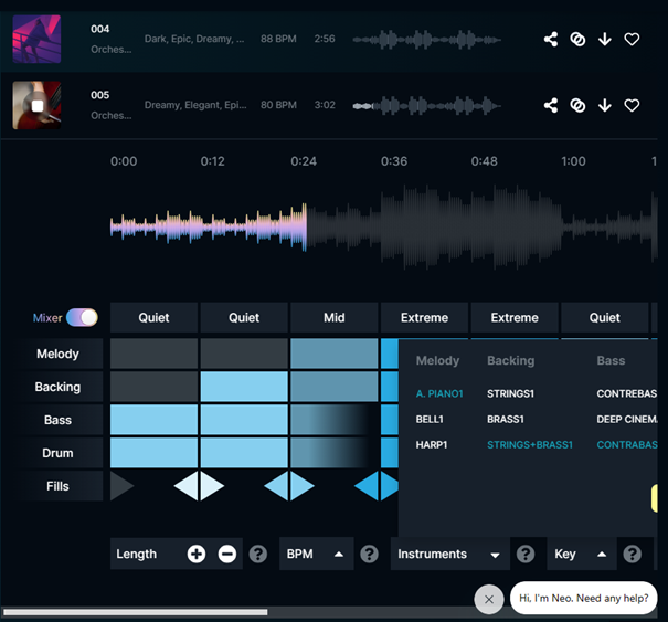 Für unseren Test haben wir uns für ein episches Orchester entschieden und direkt 15 fertige Songs erhalten. Für jeden der Vorschläge haben Sie noch Anpassungsmöglichkeiten.