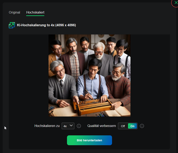 Mit dem Tool Upscale KI können Sie Bilder mit einer geringen Auflösung hochskalieren lassen. Die verwendete KI sorgt dabei dafür, dass Details erhalten bleiben und nicht verpixeln.