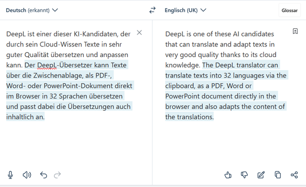 Die Rechtschreib- und Grammatikprüfung in Office-Programmen ist immer noch unzureichend und spezielle Lösungen wie der Duden Korrektor sind deutlich überlegen. Automatische Übersetzungen sind in Office-Programmen ohne fremde Hilfe noch nicht verfügbar. Im Internet haben sich jedoch zahlreiche Helfer etabliert, die mit KI-Learning deutlich bessere Ergebnisse erzielen können.