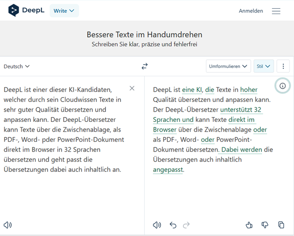 DeepL bietet als zweite Komponente die Funktion „Write“ an, mit der bestehende Texte in Bezug auf Rechtschreibung, Grammatik und Textgestaltung optimiert werden können. Die Bedienung ist sehr einfach: Der Quelltext wird in das Eingabefenster kopiert, der Schreibstil und Tonfall angepasst und die KI erledigt den Rest. Die Ergebnisse sind je nach Eingabe nicht nur frei von Fehlern, sondern sprachlich auch häufig etwas „geschliffener“.
