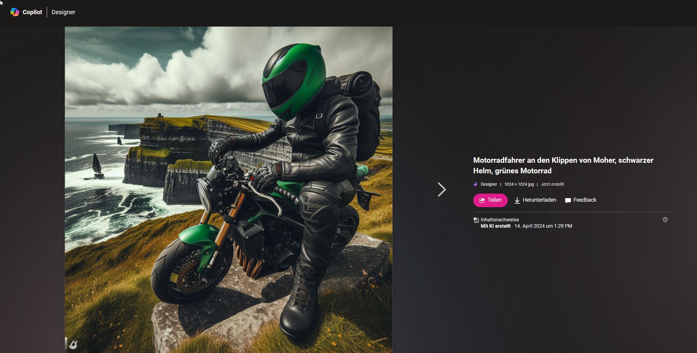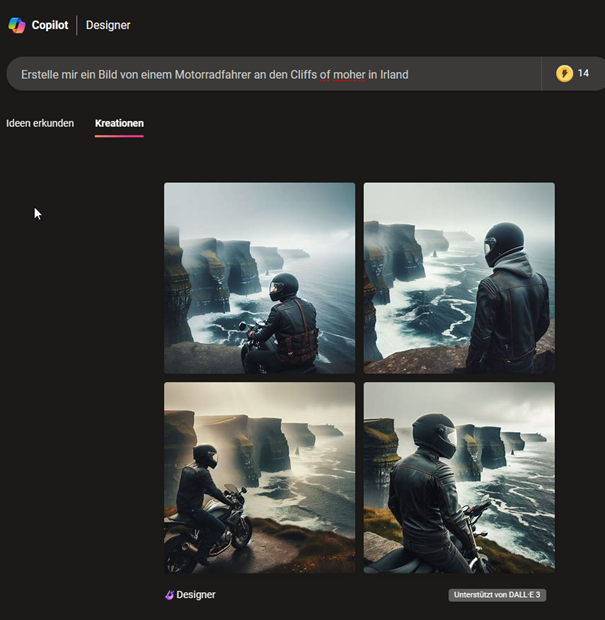 Um ein KI-Bild zu erstellen, können Sie auch mehrere Begriffe eingeben. Je detaillierter Ihre Angabe, desto genauer das Ergebnis. Geben Sie statt „Motorrad an einer Klippe“ beispielsweise „Erstelle mir ein Bild von einem Motorradfahrer an den Klippen von Moher, welcher einen schwarz-grünen Helm trägt und dabei auf das Wasser blickt. Er soll dabei auf einem grünen Motorrad sitzen“ ein, um ein noch genaueres Ergebnis zu erzielen.