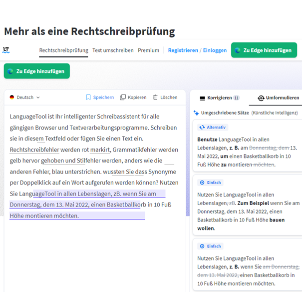LanguageTool deckt auch Bereiche von DeepL Write ab. In der kostenlosen Version kann es jedoch nur Texte umformulieren und keine weiteren Fehler anzeigen. Es wird auch eine Browser-Erweiterung für gängige Browser angeboten.