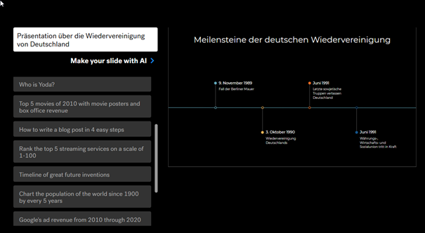 Neben einfachen Folien mit einem einheitlichen Layout kann der Dienst auch Graphen, Diagramme, Zeitleisten bzw. Zeitstrahl, Gannt-Diagramme, SWOT-Analysen oder Flussdiagramme erstellen.