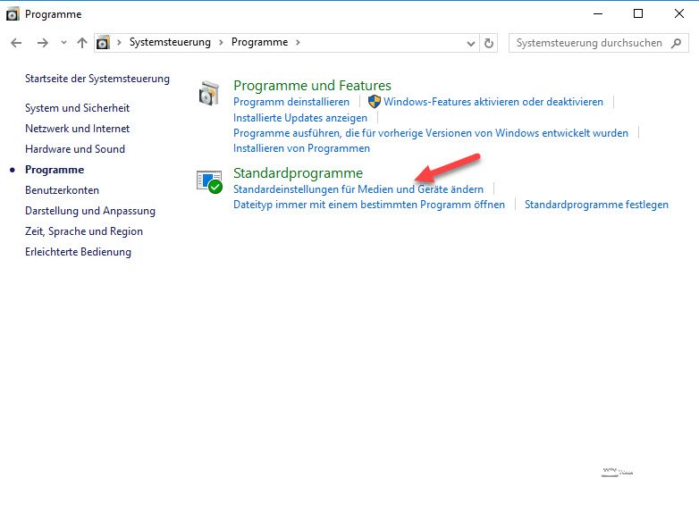 Wechseln Sie dazu in die „normale“ Systemsteuerung. Unter „Programme“ finden Sie den Eintrag „Standardprogramme“. Klicken Sie hier auf den Eintrag „Standardeinstellungen für Medien und Geräte ändern“.