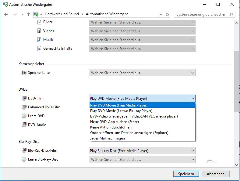 Sie können dann im folgenden Fenster unter DVDs (und Blu-Rays) festlegen, welches installierte Programm beim Einlegen von Film-DVD/Film-Blu-Ray den Film direkt starten soll.
