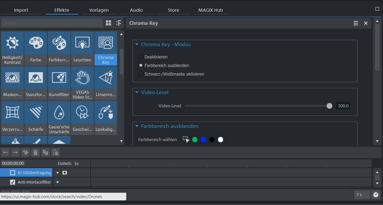 Die Funktion Chroma Key, mit der Objekte für den Greenscreen freigestellt und mit einem anderen Hintergrund versehen werden können, wurde vereinfacht und überarbeitet.
