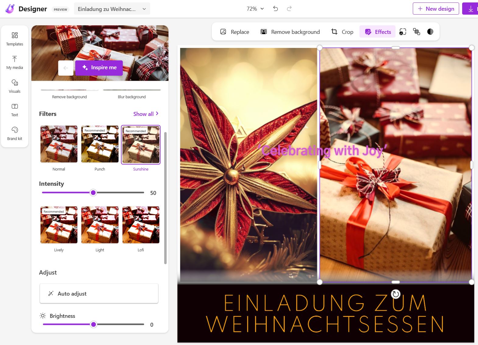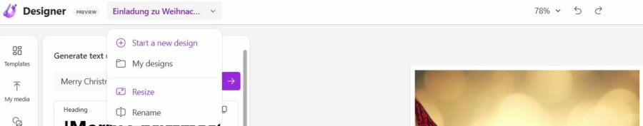 Sind Sie mit dem Design noch nicht zufrieden oder möchten noch individuelle Anpassungen vornehmen, klicken Sie dagegen auf „Customize design“. Der Microsoft Designer öffnet dann einen Editor mit verschiedenen Leisten und Werkzeugen.