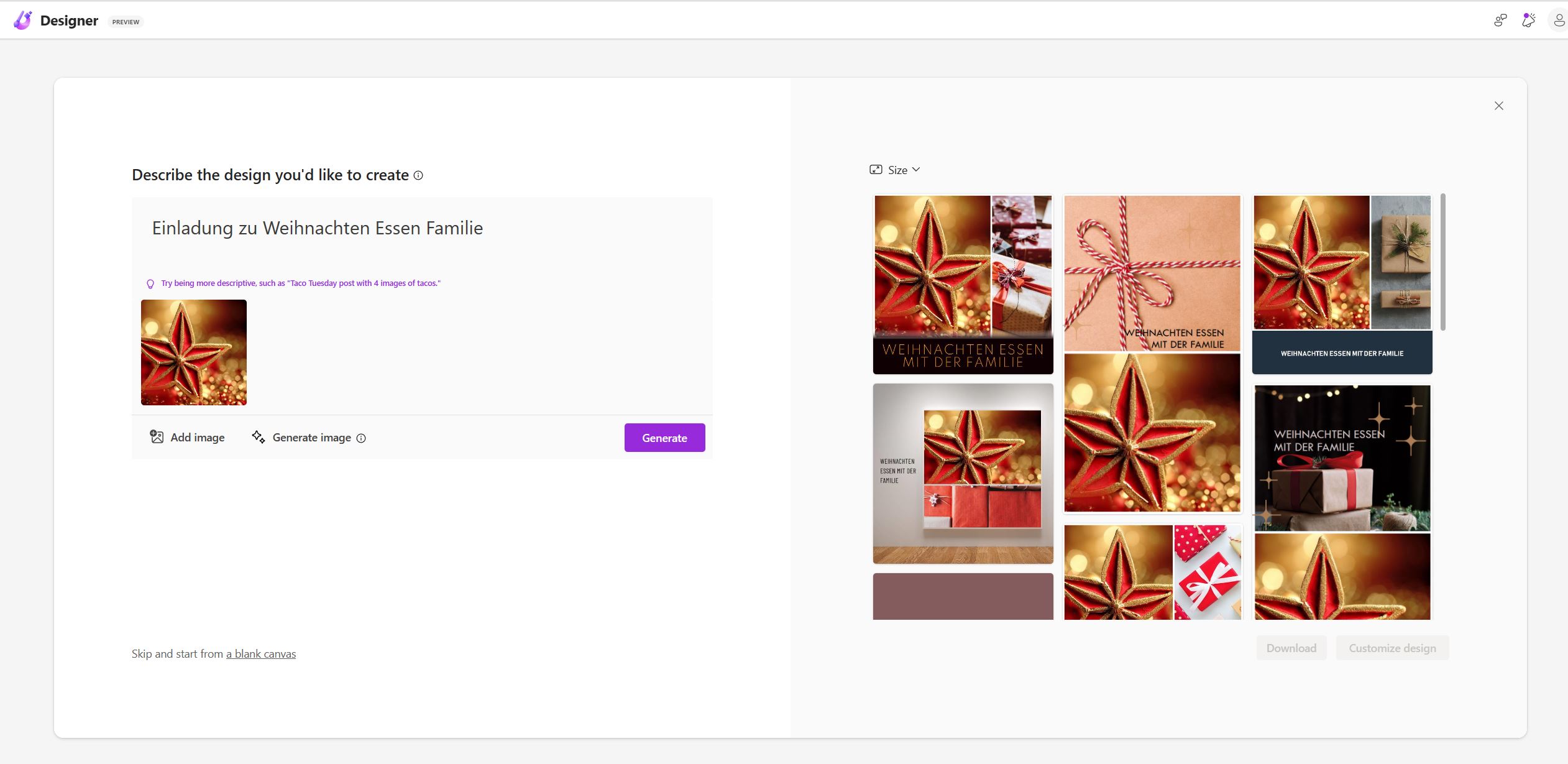 Wenn Sie keine geeigneten Bilder zur Verfügung haben, können Sie über die Schaltfläche „Generate Image“ neue Bilder erstellen lassen. In unserem Beispiel benötigen wir einen Weihnachtsstern und lassen uns von der KI mehrere Bilder davon erstellen.