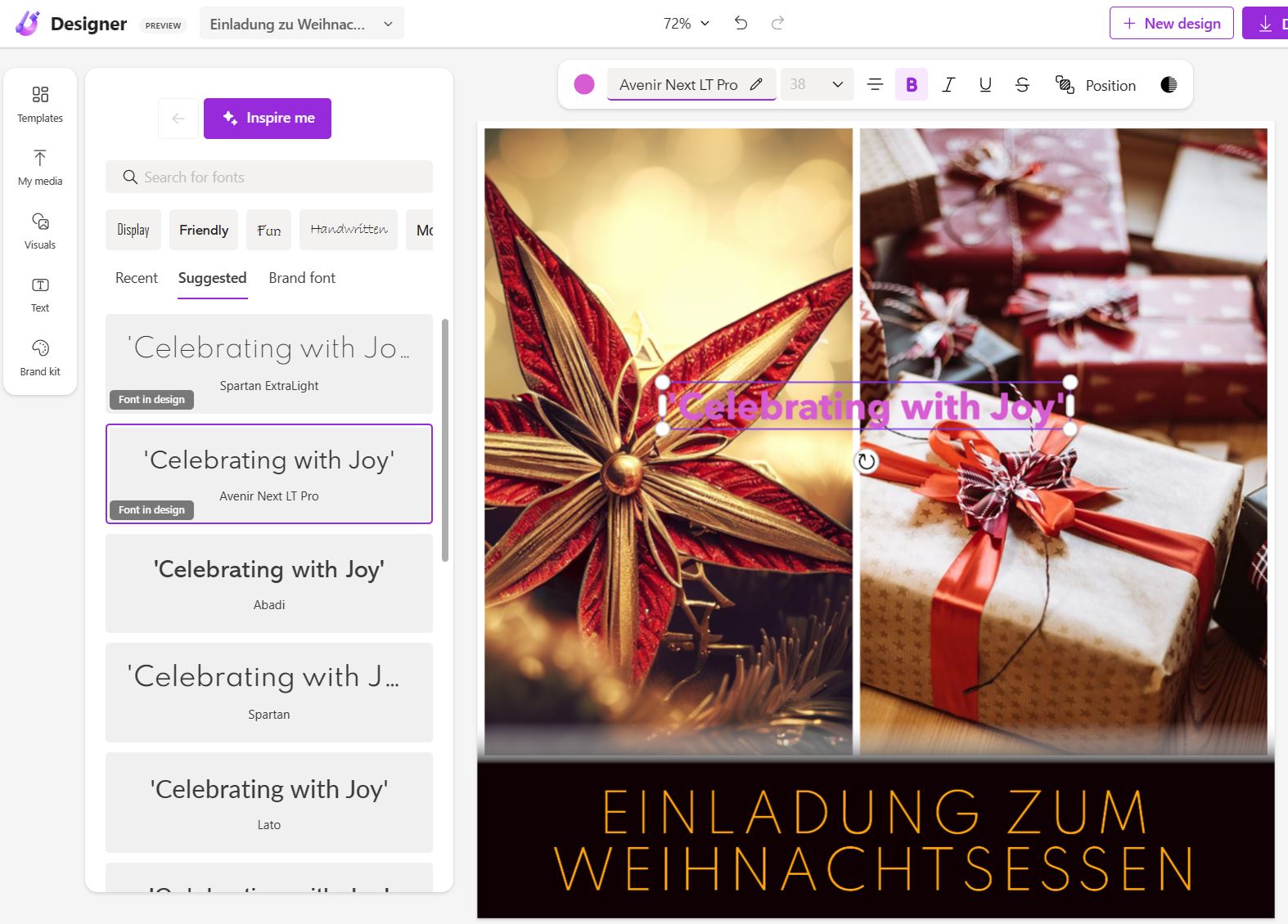 Das Textwerkzeug bietet viele Gestaltungsmöglichkeiten wie verschiedene Schriftarten, Farben oder Ausrichtungen. Wenn Sie sich gar nicht entscheiden können, schlägt Ihnen der Button „Inspire me“ verschiedene Layouts für den Text vor