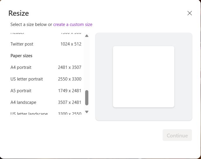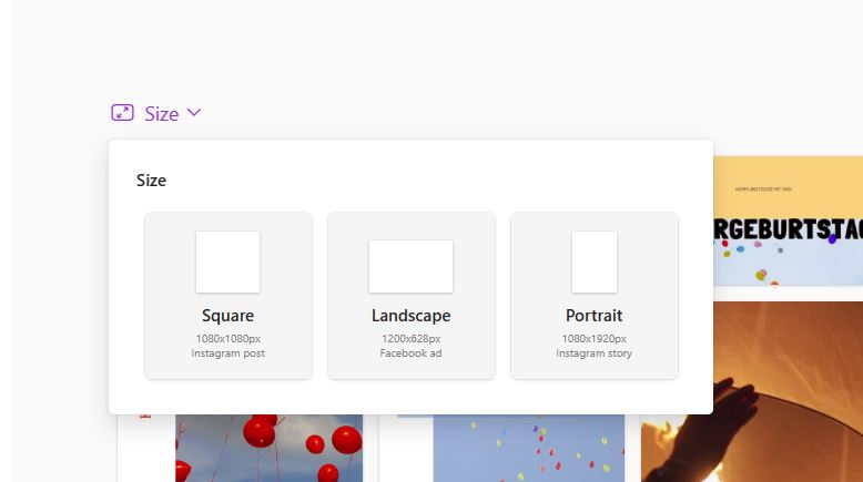 Die Auswahl an Design-Größen reicht verschiedenen Formaten für Social Media Posts, bis zum Druck in A4. Sie können aber auch eigene Design-Größen festlegen.
