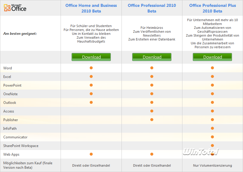 Die Beta zu Office 2010 lässt sich bis zum 31.10.2010 benutzen. Auf Grund des unterschiedlichen Lieferumfangs gibt es aktuell 3 verschiedene Editionen als Beta zum Download, welche hier aufgelistet werden.