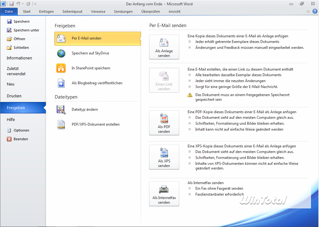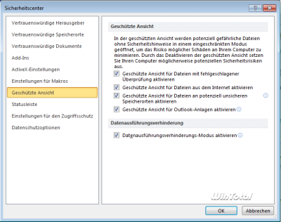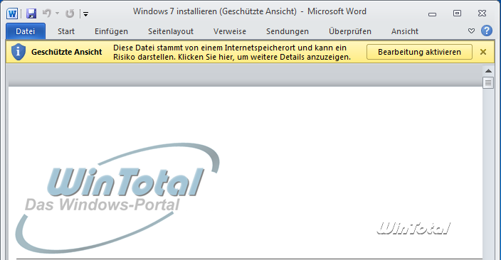 Die geschützte Ansicht ist eine weitere Neuerung in Word 2010. Word-Dokumente aus unsicheren Quellen wie z.B. dem Internet oder einem E-Mail-Anhang können in einer geschützten Ansicht geöffnet werden. Hierbei deaktiviert Word alle aktiven Inhalte in dem Dokument (z.B. Makros, ActiveX-Steuerelemente oder Datenverbindungen).