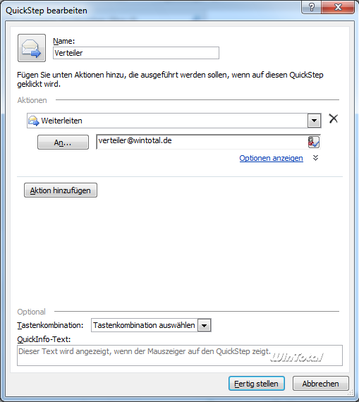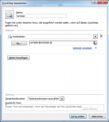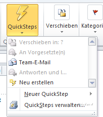 Hierbei handelt es sich um vorgegebene Aktionen, die der Anwender nur noch anklicken muss, um diese anzustoßen (.z.B. „Verschiebe in Ablage Projekt“ oder „leite an Verteiler XY weiter“), ohne hierfür allgemeingültige Regeln anlegen zu müssen. Neben den bereits vorhandenen QuickSteps kann der Anwender auch eigene erstellen.