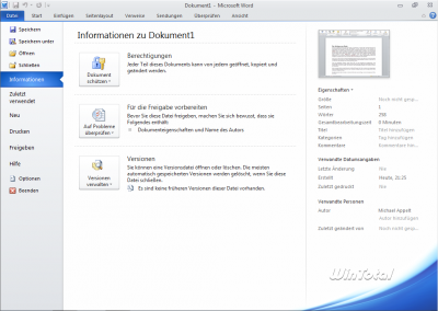 Der Bereich im Menü „Datei“, den Microsoft als „Backstage“ bezeichnet, wirkt auf den ersten Blick viel umfangreicher. Dies täuscht aber. Vielmehr hat Microsoft die Dokumenteigenschaften nun direkt in den Fokus des Anwenders gerückt und Berechtigungen oder Versionsverwaltung direkt in den Zugriff des Nutzers.
