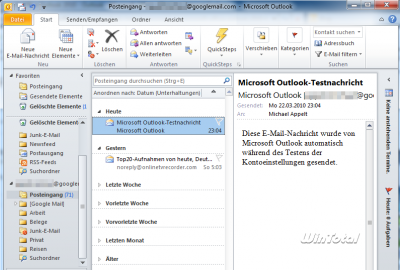 Auch die Unterstützung von IMAP-Konten ist nach Aussage der Entwickler verbessert worden, was durch die immer stärkere Verbreitung größerer Onlinepostfächer sicherlich die richtige Entscheidung war. POP3 ist definitiv auf dem absteigenden Ast. Mail-Konten von Anbietern wie Google werden standardmäßig als IMAP-Account in Outlook eingerichtet. Die dafür notwendigen Serverangaben fand Outlook 2010 selbstständig.