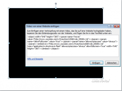 Im dem folgenden Fenster gibt man den kompletten Einbindungs-Code ein, den beispielsweise YouTube unterhalb des Videolinks bereitstellt.