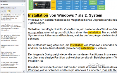 Die 3. Registerkarte im Bereich Navigation dient zur Suche innerhalb von Dokumenten und zeigt die Treffer hier abschnittsweise an, während sich rechts dazu jeweils die Originalseite findet.