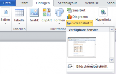 Unter „Einfügen“ findet sich nun neben Clipart, Grafik, Formen und SmartArt der Eintrag „Screenshot“, mit dem solche von geöffneten Programmfenstern ohne viel Aufwand direkt in das Dokument übernommen werden können.